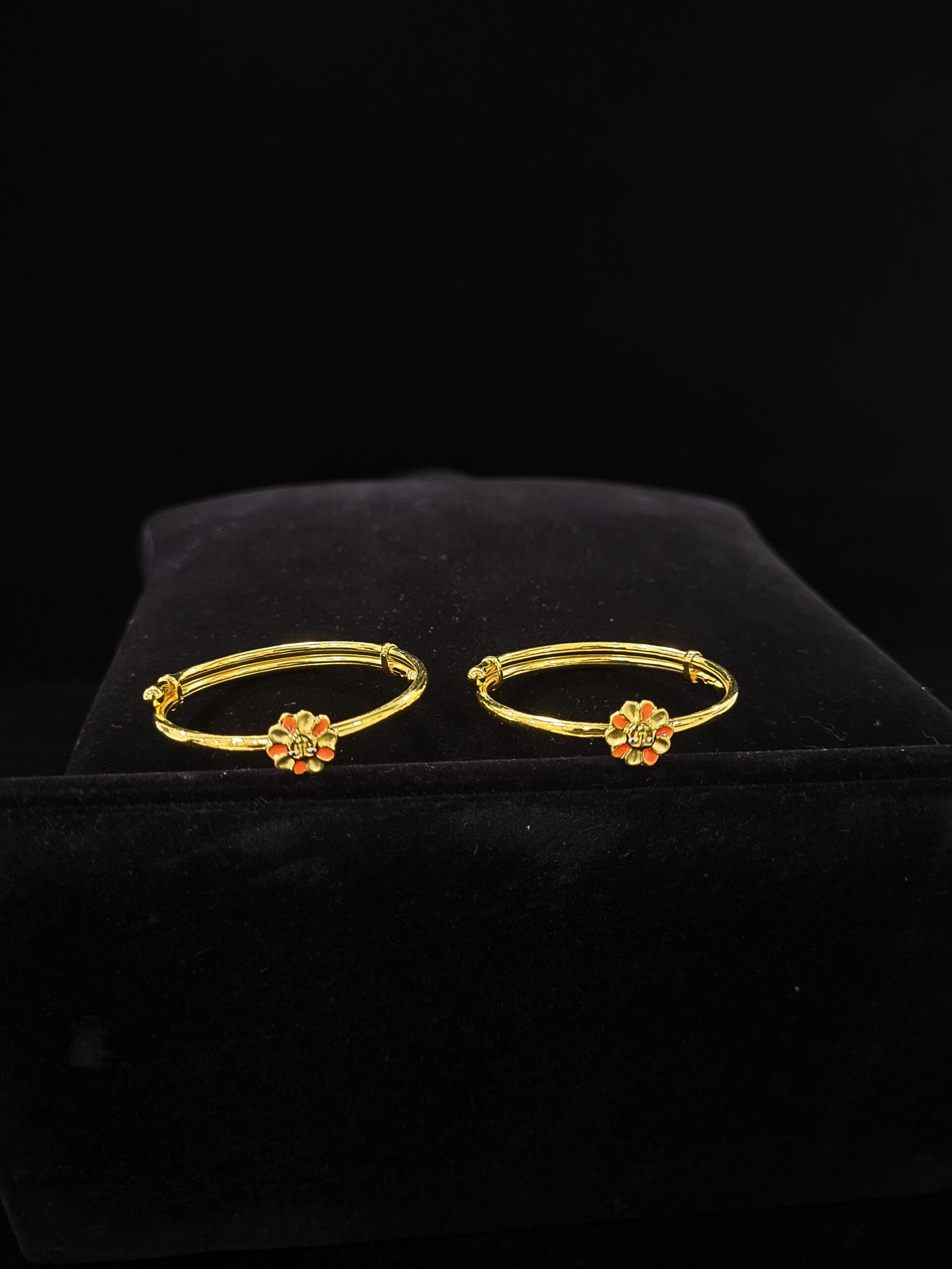 The Marigold Radiance Bangles are designed to offer a subtle yet striking pop of color for everyday elegance. Each piece features a slender, circular gold band with a brilliant mirrored finish that catches the light beautifully. The focal point is a delicately crafted flower charm, its petals finished in a rich, sunset-orange enamel that evokes the warmth of a blooming marigold.