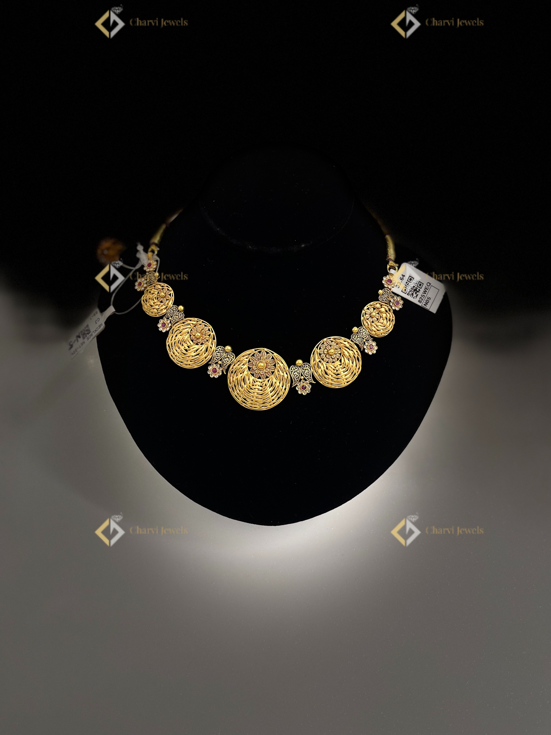 Discover the allure of bespoke gold artistry at Charvi Jewels, your destination for custom heirloom pieces on TVS Road, R. S. Puram, Coimbatore. This necklace exemplifies our dedication to craftsmanship, offering a glimpse into the personalized designs we create. Visit Charvi Jewels, new jewelry store in RS Puram, and let us bring your vision to life with our custom heirloom service. Each piece is crafted with passion, making us the artistic jewelry shop near RS Puram. We specialize in modern gold designs Coimbatore, ensuring your story is told through exceptional jewelry.