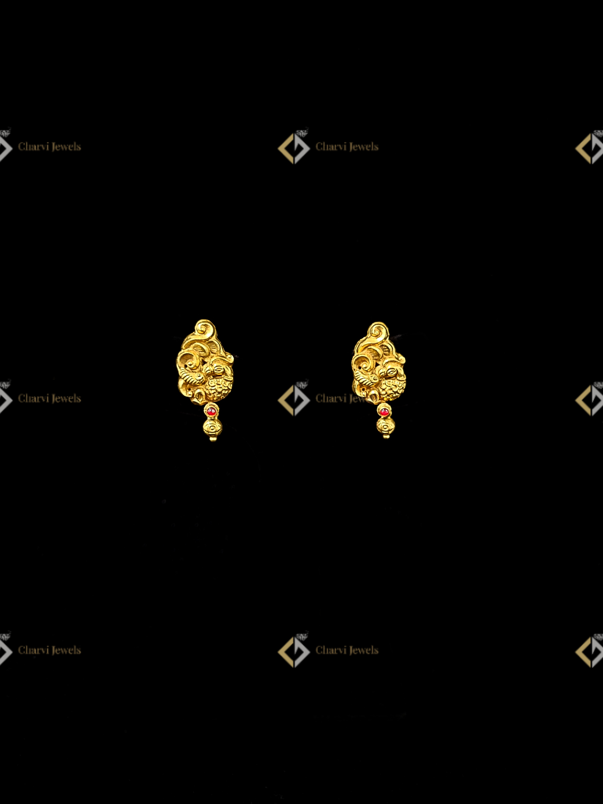 Glimmering gold catches the light, shaped into intricate floral motifs. These Charvi Jewels creations are an ode to tradition. Tiny ruby pendants dangle delicately, adding a touch of vibrant color. The dark background enhances the gold’s radiant warmth. They evoke timeless elegance, a perfect statement piece, and whisper stories of ancient craftsmanship. Each detail is meticulously crafted, a testament to the artisans’ skill.