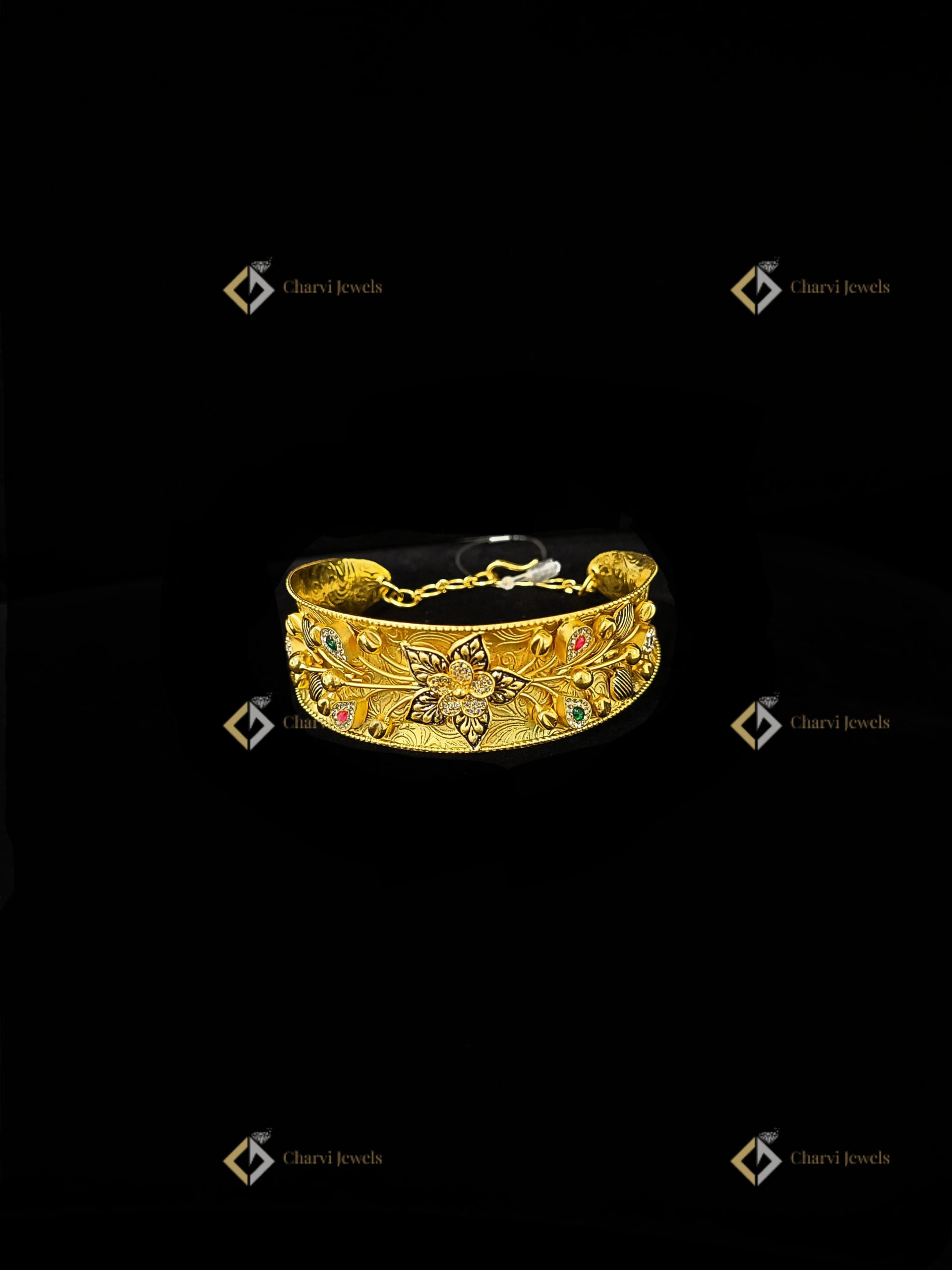 This opulent floral gemstone gold ring represents bespoke artistry at its finest, a testament to Charvi Jewels’ commitment to creating future heirlooms. Crafted from investment-grade gold and adorned with meticulously selected gemstones, this ring reflects your refined taste. Each detail, from the delicate golden petals to the vibrant ruby and emerald accents, showcases exceptional craftsmanship. Visit Charvi Jewels at TVS Road, R. S. Puram, Coimbatore, to commission your own custom heirloom piece, designed to be cherished for generations. Our artistic jewelry store is ready to serve you.
