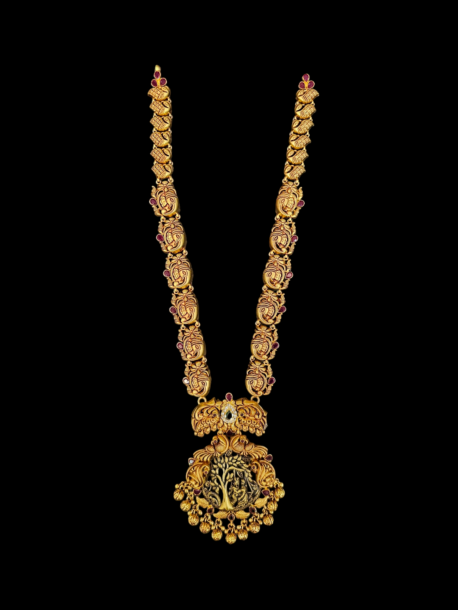 This haram features a central Goddess Lakshmi pendant surrounded by detailed vriksha (tree of life) motifs, crafted with precision. The design draws from classical South Indian temple jewellery traditions while maintaining a refined, wearable structure that suits modern brides. The craftsmanship ensures that every curve and carving is sharp, clean, and visually rich.