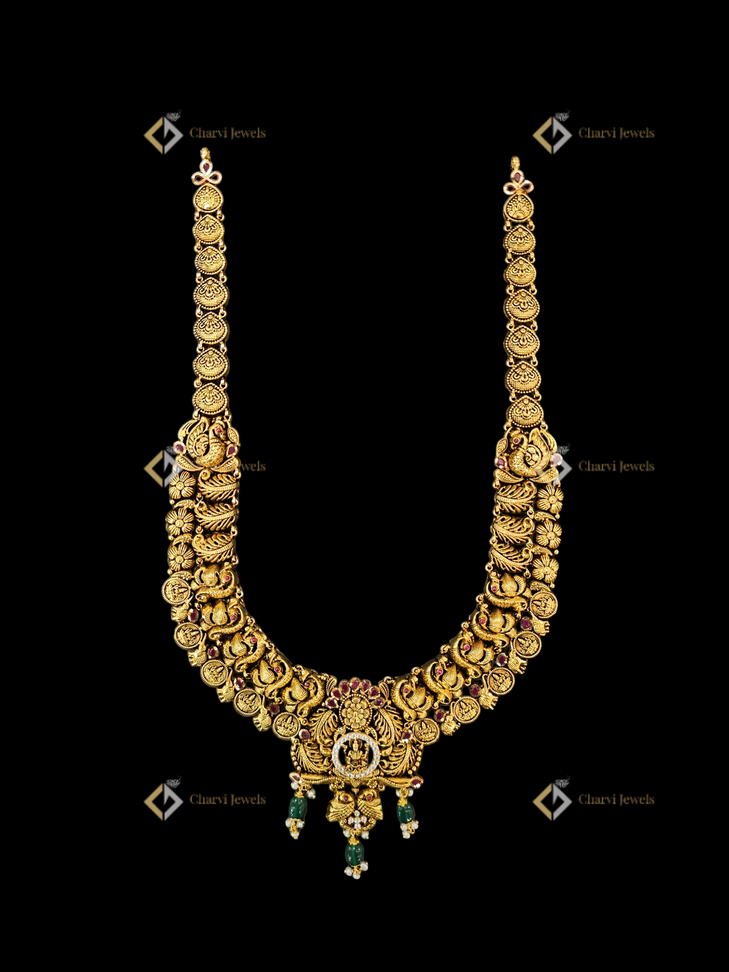At Charvi Jewels, TVS Road, R. S. Puram, Coimbatore, we understand the desire for jewelry that transcends mere adornment. Our specialization in custom heirloom pieces and bespoke gold artistry ensures your vision becomes a reality. This magnificent Temple Coin Peacock Gold Haram is a testament to our dedication. It showcases intricate craftsmanship using the finest gold, rubies, emeralds and pearls. Crafted by skilled artisans, this piece exemplifies our commitment to preserving heritage while embracing contemporary design. Visit our store at TVS Road, R. S. Puram, Coimbatore, to explore our collections or begin your journey toward a truly unique creation.