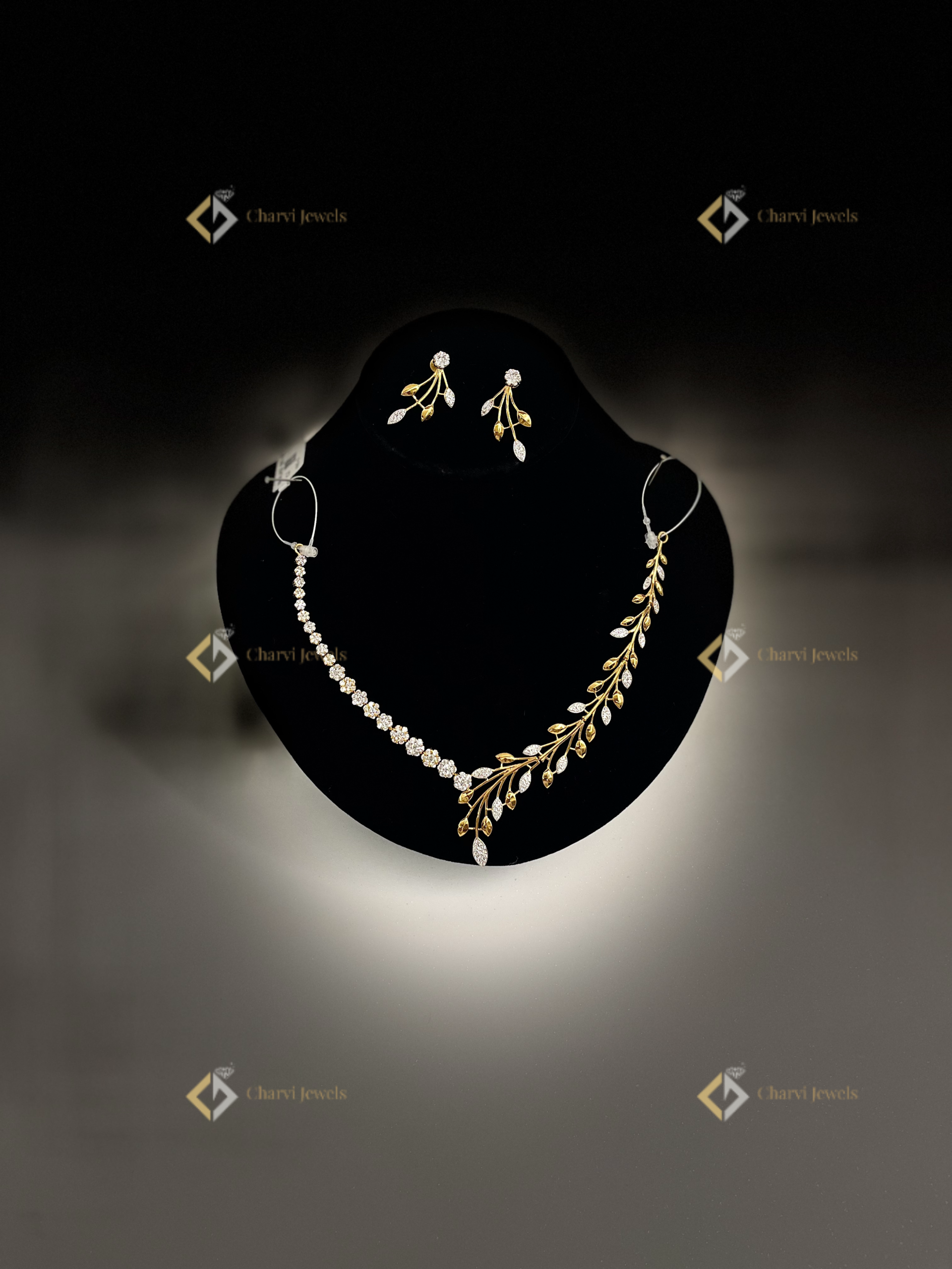Discover artistry at Charvi Jewels, your Coimbatore destination for unique gold jewelry. This exquisite necklace and earrings set exemplifies our commitment to innovative design. One side showcases a diamond vine with delicate gold leaves, balanced by diamond floral clusters on the other. The earrings mirror the vine design, creating a stunning, asymmetrical statement. At Charvi Jewels on TVS Road, R. S. Puram, find bespoke creations that reflect your individual style. Our skilled artisans craft stunning gold jewelry, from modern designs to heritage pieces. Visit us and experience the beauty of truly artistic gold jewelry.