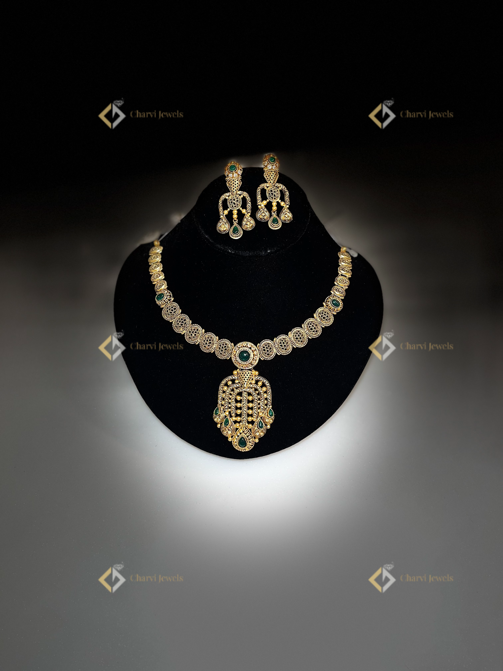 Charvi Jewels on TVS Road, R. S. Puram, Coimbatore, offers unparalleled bespoke gold artistry. This Emerald Filigree Gold Necklace with Earrings is a testament to our dedication to crafting custom heirloom pieces. Visit our new jewelry store RS Puram to witness the meticulous detail and superior craftsmanship firsthand. We specialize in modern gold designs Coimbatore, ensuring each piece reflects your unique style. Our artisans transform your vision into reality. Experience the Charvi difference and create your family’s next treasured custom heirloom.