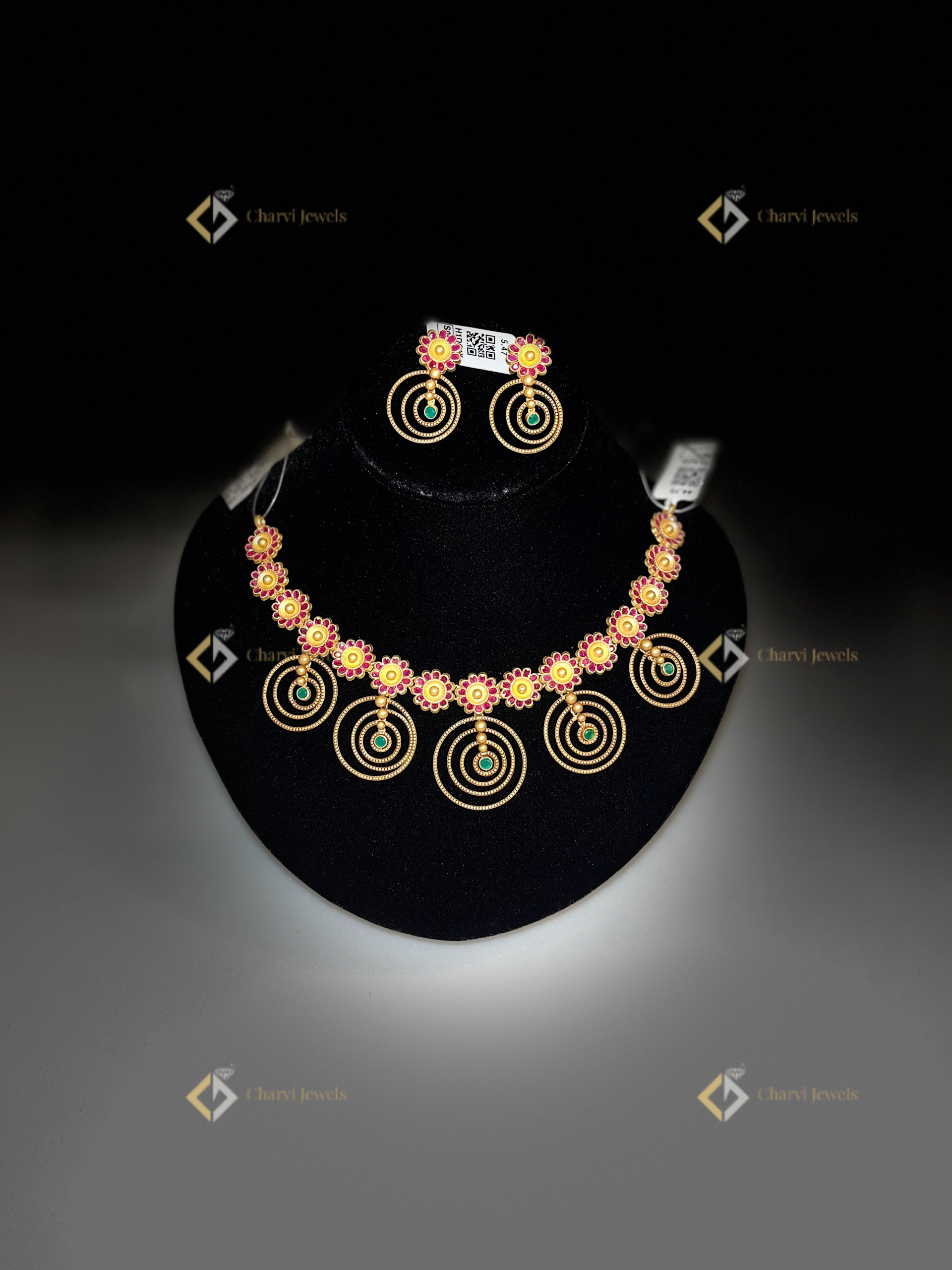 Discover the timeless allure of the Floral Ruby Hoops Necklace with earrings at Charvi Jewels, your trusted gold jewellers in RS Puram, Coimbatore. Our artistic gold jewelry is meticulously crafted, featuring vibrant rubies and captivating designs. Each piece reflects a blend of tradition and contemporary aesthetics. Visit our TVS road store, where skilled artisans create custom jewelry, ensuring a personalized experience. Explore our modern gold designs and find the perfect piece to celebrate every special moment. Charvi Jewels is your destination for unique, artistic jewelry near RS Puram.