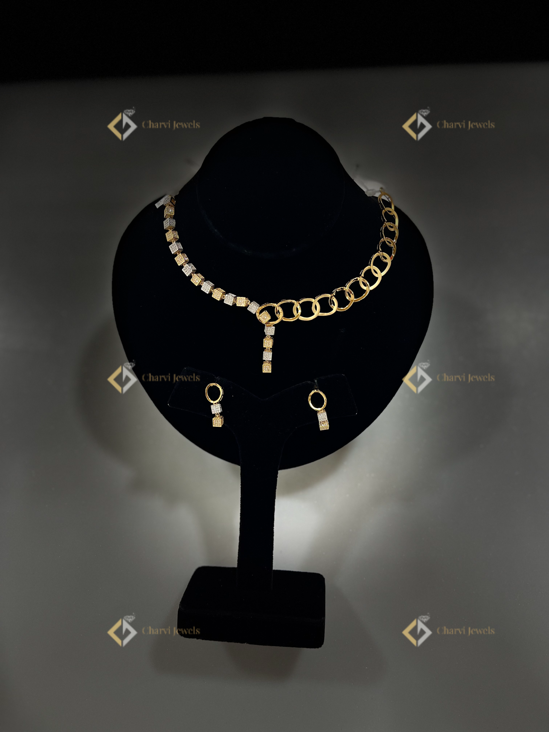 Discover the artistry of modern gold jewelry at Charvi Jewels, your artistic gold jewelry store on TVS Road, R. S. Puram, Coimbatore. This geometric cube necklace and earrings set is an elegant display of our custom jewelry making skills. Crafted with meticulous attention to detail, this exquisite set features geometric cubes linked by delicate gold loops. The two-tone gold adds visual depth and a touch of modern sophistication. Visit our TVS road store and find the perfect piece to reflect your unique style. We offer a wide range of artistic gold jewelry designs.