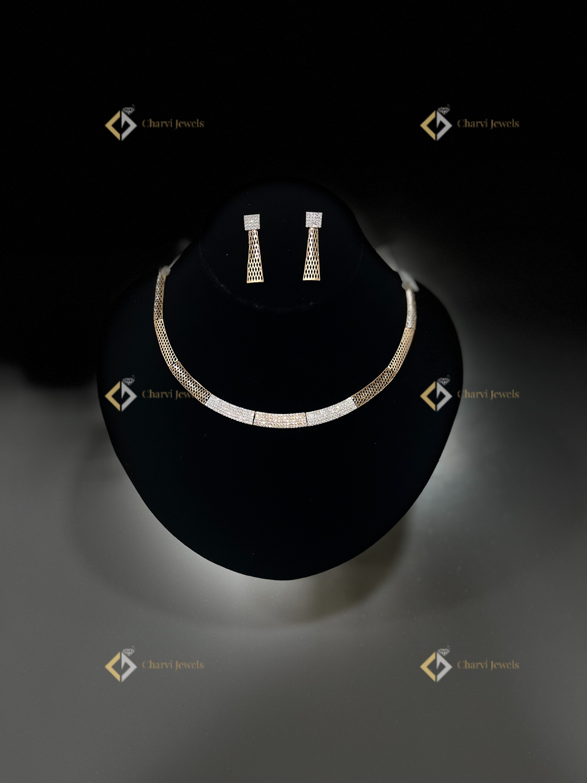 Bathed in ethereal light, this radiant gold necklace and earring set features precise geometric patterns. The latticework reflects a mesmerizing play of light. Delicate lines converge, crafting a spectacle of modern elegance. A testament to refined artistry, the set promises to elevate any ensemble. Its understated glamour speaks volumes of sophisticated taste, perfect for celebrating life’s most cherished moments.