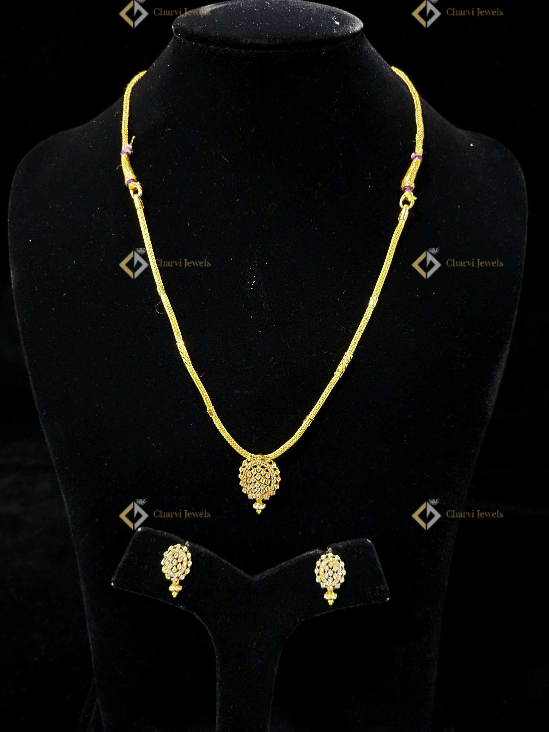 Discover the allure of handcrafted gold jewelry at Charvi Jewels, your artistic gold jewelry specialist in Coimbatore. Located on TVS Road, R. S. Puram, we offer custom jewelry making and unique gold designs. This exquisite necklace and earrings set features a round white stone cluster with a gold drop. Visit our store to experience our handcrafted artistic gold jewelry and explore modern gold designs. Find the perfect piece to reflect your style with Charvi Jewels’ new jewelry store on RS Puram.