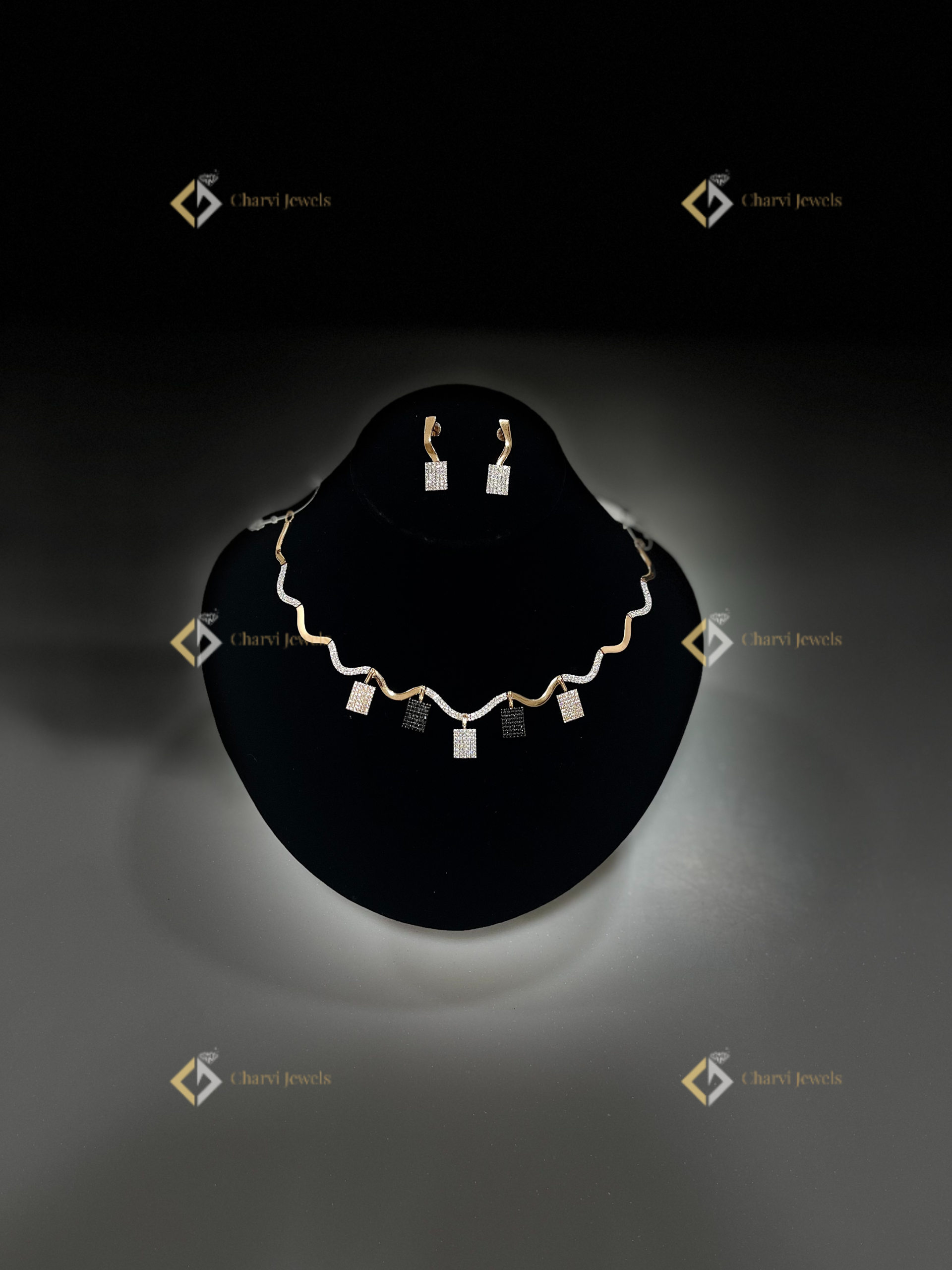 Elevate your style with the Light & Dark Wavy Gold Necklace and earrings set from Charvi Jewels. This exquisite set features a contemporary design with a wavy gold chain adorned with alternating light and dark square pendants, creating a captivating visual contrast. The matching earrings perfectly complement the necklace, enhancing the overall elegance. Discover this masterpiece at Charvi Jewels, located on TVS Road, R. S. Puram, Coimbatore. We specialize in artistic gold jewelry and custom jewelry making, offering unique designs that blend tradition with modern aesthetics. Find your perfect piece at our TVS road store!