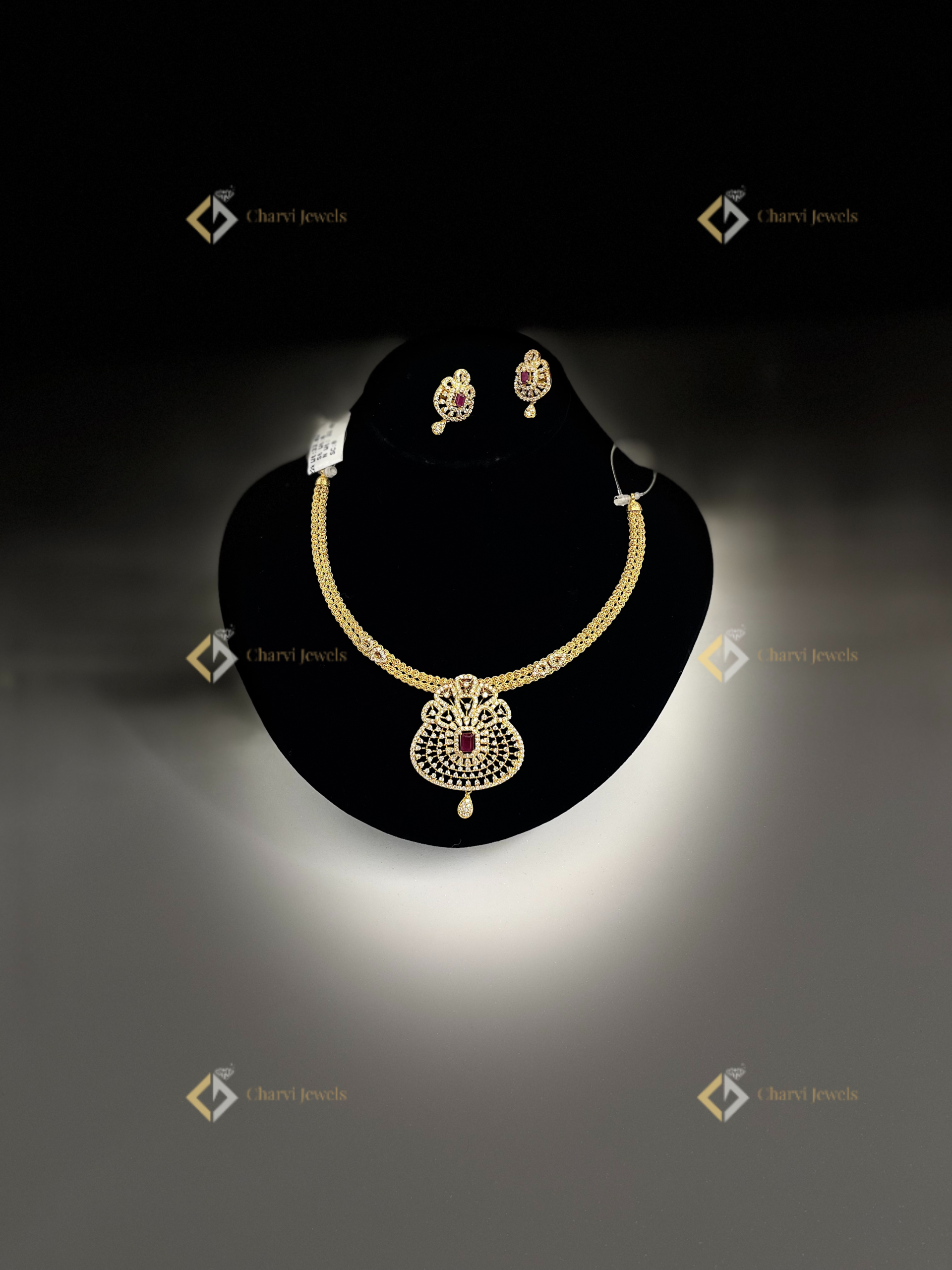 At Charvi Jewels, TVS Road, R. S. Puram, Coimbatore, discover bespoke gold artistry that transcends generations. This Ruby Filigree Gold Necklace with Earrings is a testament to our commitment to crafting custom heirloom pieces. The delicate filigree work, combined with the vibrant ruby, showcases our dedication to detail and quality. Seeking to design your own custom jewelry? Visit our store for a consultation, where we will create your masterpiece using the finest materials. We specialize in modern gold designs, ensuring you get a unique piece that reflects your personal style. We are easily the best gold jewellers RS Puram Coimbatore.