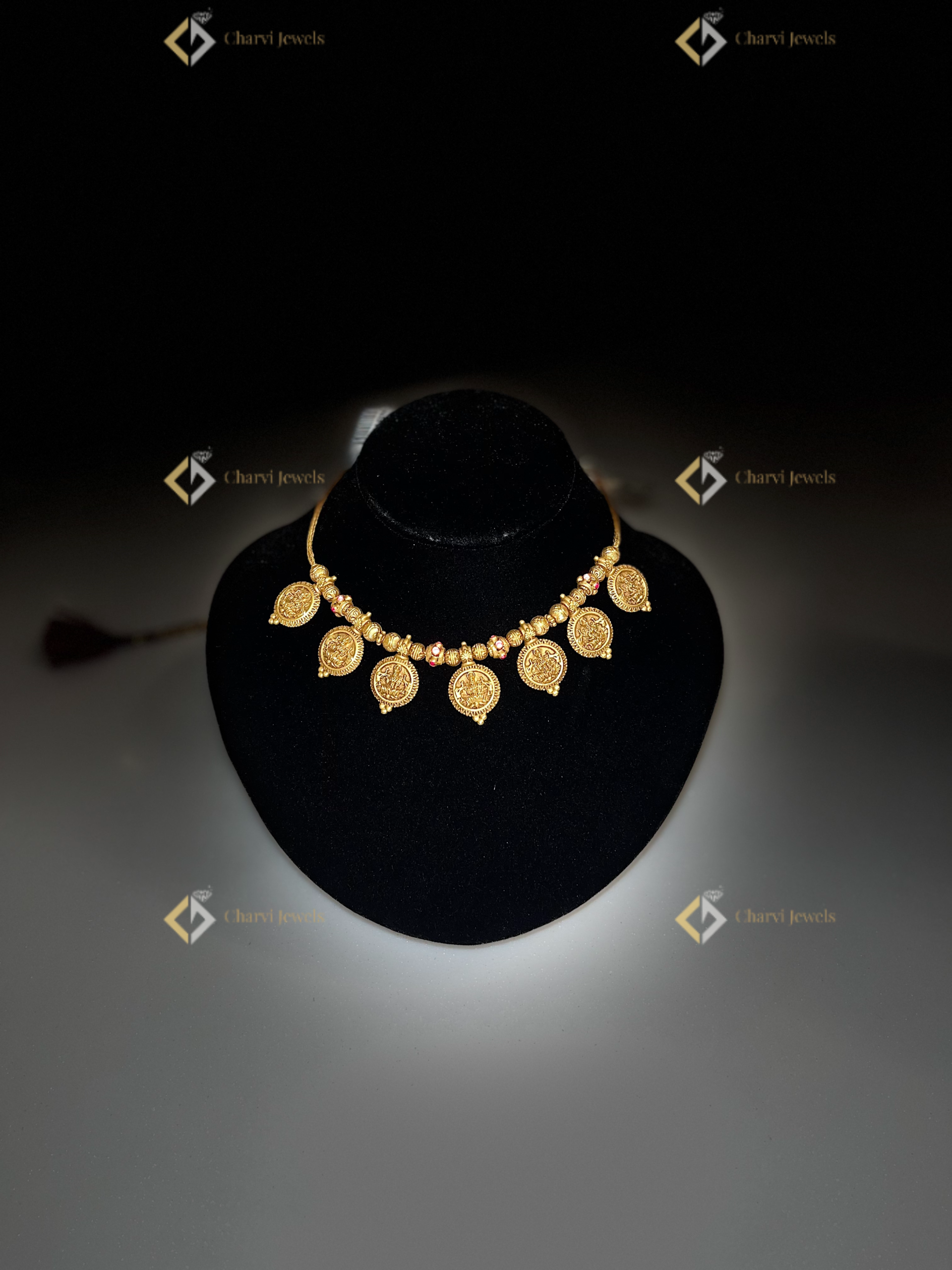 A radiant gold necklace gracefully drapes, featuring intricately detailed Lakshmi coins. Each coin tells a story, shimmering with subtle textures and reflecting light. The warm gold tone contrasts beautifully against the dark backdrop, emphasizing the necklace’s exquisite craftsmanship. Delicate ruby accents add a touch of color, completing this stunning piece of wearable art. It is an embodiment of tradition meeting elegance, captured in a single, captivating frame.