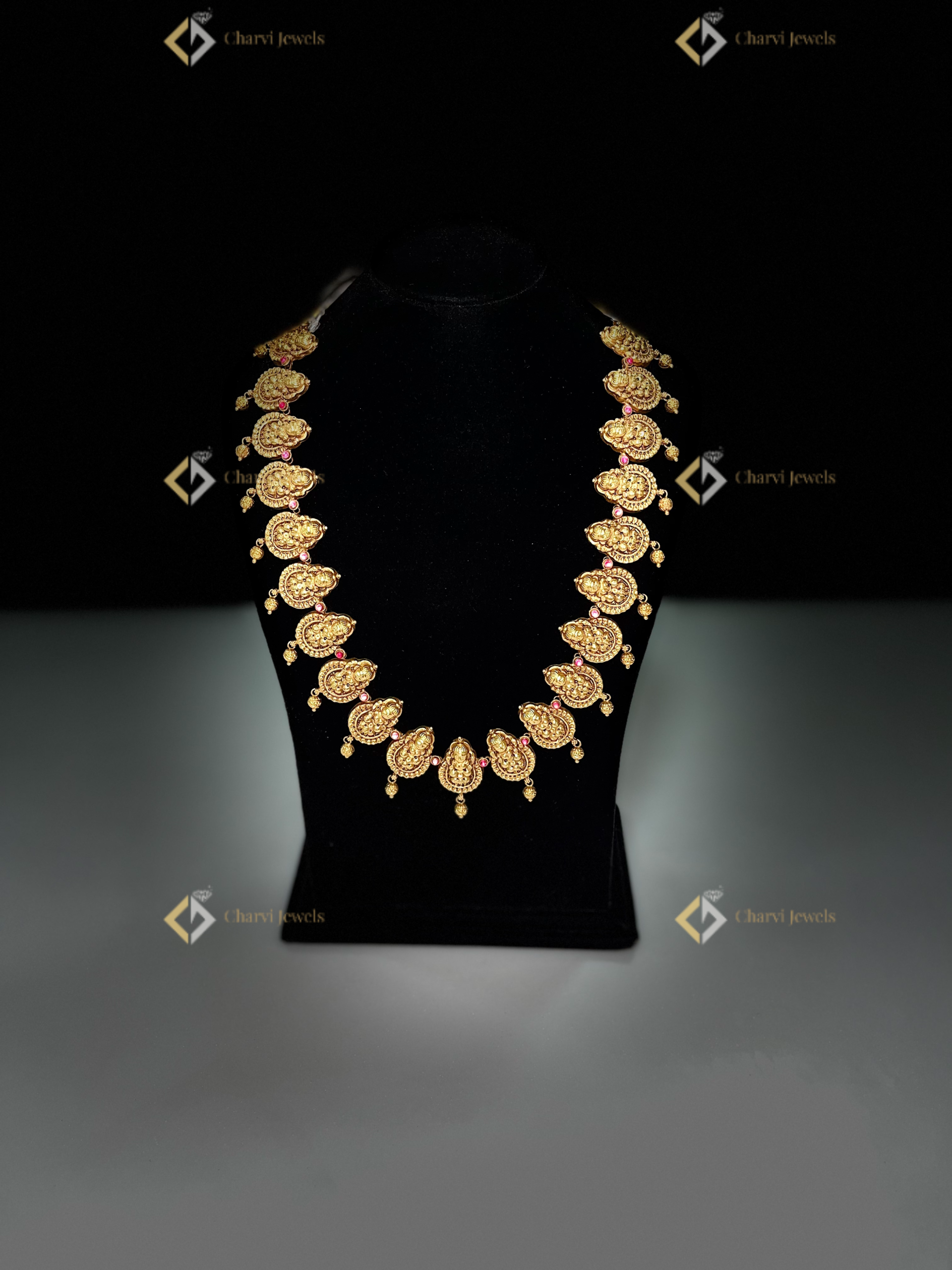 This radiant gold necklace showcases antique Lakshmi motifs adorned with ruby accents. It’s a testament to timeless elegance. Each sculpted detail highlights the rich heritage and artistry. It is perfect for adding a touch of traditional grace to any ensemble. The intricate craftsmanship makes it a treasured piece.