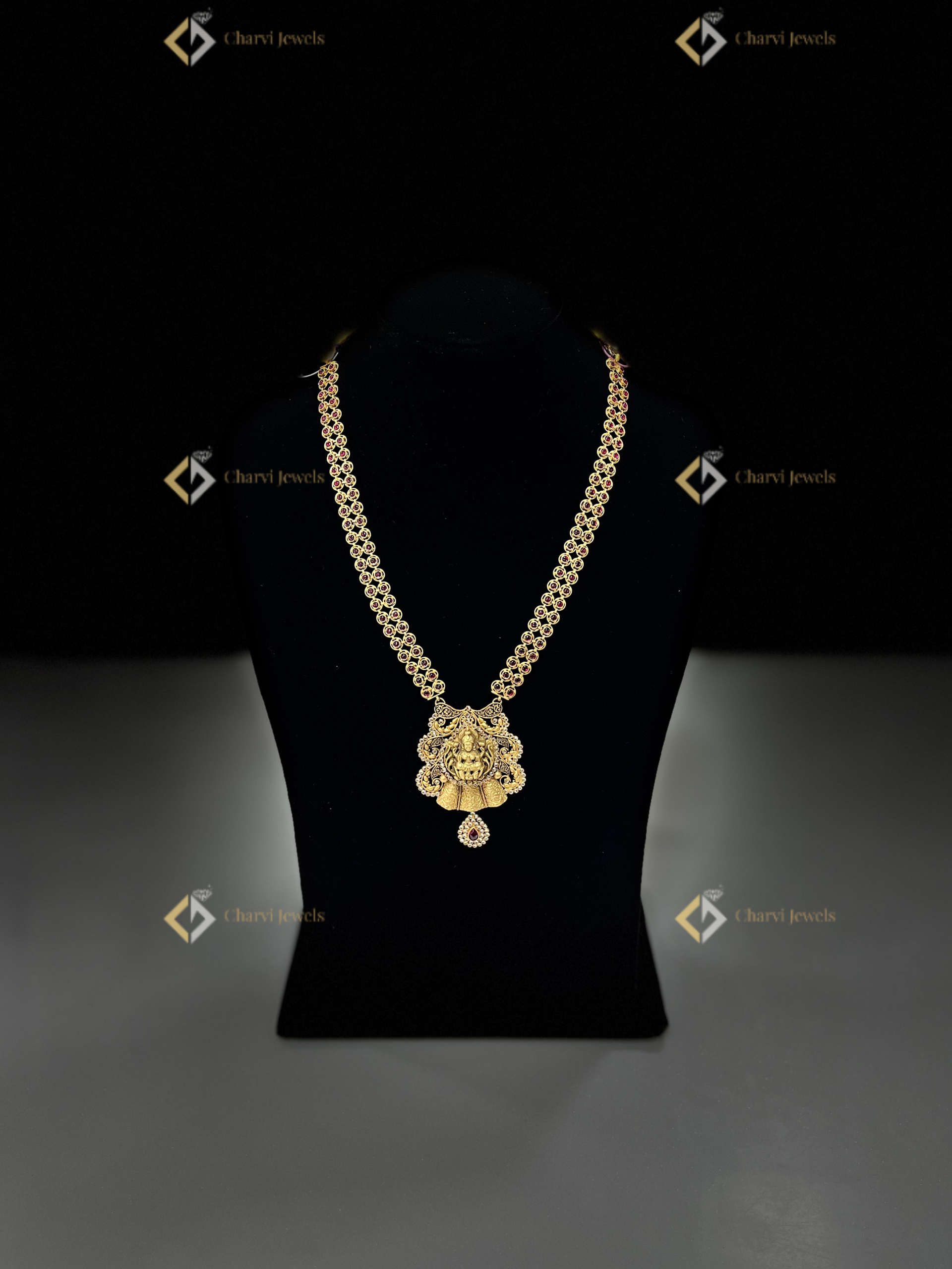 Discover the unparalleled artistry of Charvi Jewels with this Divine Ruby Lakshmi Necklace, a testament to bespoke gold artistry. Located at TVS Road, R. S. Puram, Coimbatore, we specialize in crafting custom heirloom pieces that resonate with your unique story. Each piece reflects intricate detail and embodies the rich heritage of South Indian jewelry design. Experience the legacy of Charvi Jewels, where time-honored techniques meet modern gold designs, creating treasures to be cherished for generations. Explore our collection or commission your very own custom jewelry masterpiece, where your vision comes to life. Visit our store at RS Puram, Coimbatore.