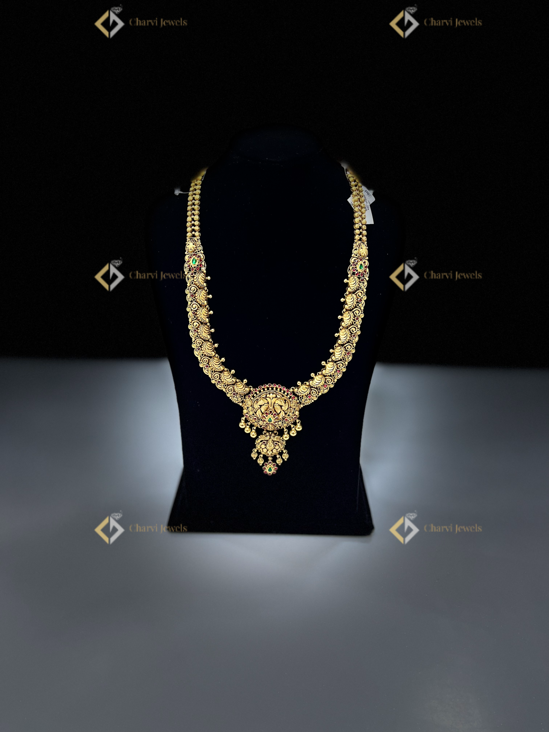 This Heritage Emerald Gold Necklace exemplifies Charvi Jewels’ commitment to bespoke gold artistry. Located on TVS Road, R. S. Puram, Coimbatore, we craft custom heirlooms blending traditional designs with modern aesthetics. The intricate craftsmanship reflects our dedication to preserving cultural heritage. Our artisans meticulously handcraft each piece, ensuring unparalleled quality. We specialize in custom jewellery making, enabling clients to design unique pieces that embody their personal stories. Charvi Jewels creates lasting legacies with gold, emeralds, and rubies. Visit our store and experience the finest in handcrafted jewellery.