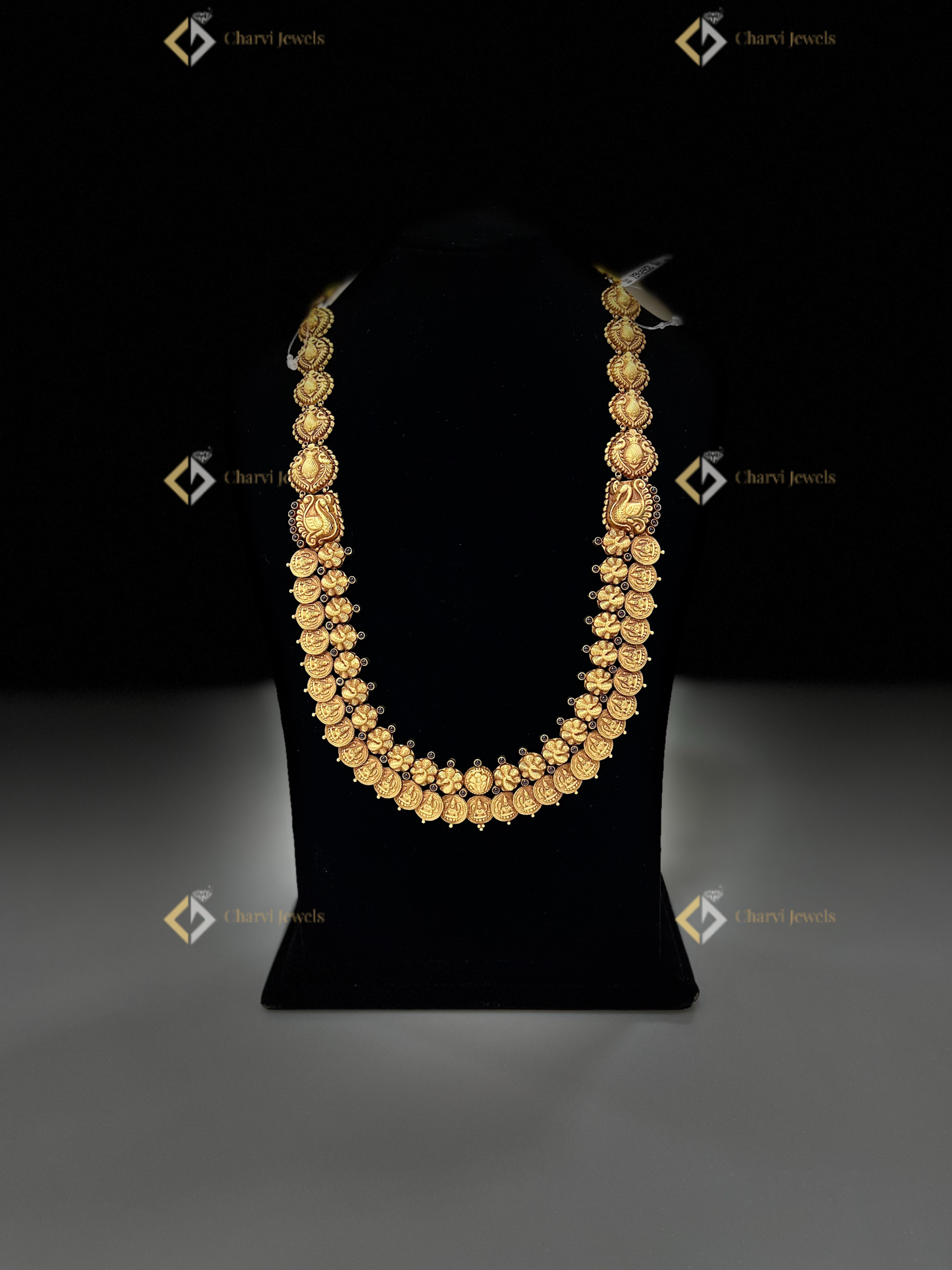 At Charvi Jewels on TVS Road, R. S. Puram, Coimbatore, discover this Lakshmi Swan Coin Gold Necklace, a testament to bespoke gold artistry. We specialize in crafting custom heirlooms that reflect your unique story. Each piece is meticulously designed and brought to life by skilled artisans. Our commitment to quality ensures that every detail is perfect. Visit our store in Coimbatore to experience the allure of custom jewelry. Let us create a cherished family heirloom. Elevate your style with a piece that embodies elegance and tradition. Charvi Jewels creates more than jewelry. We create art.