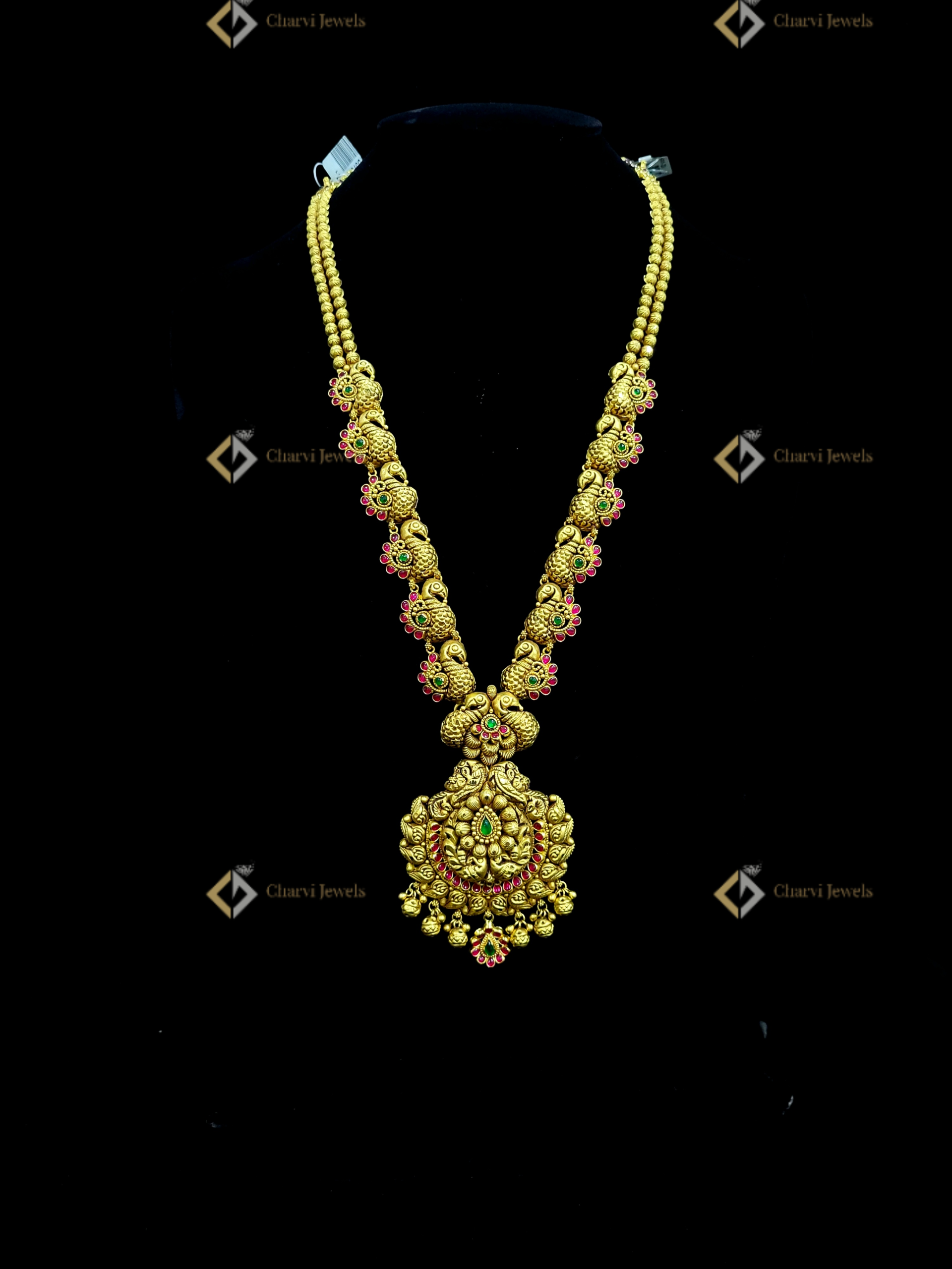 The Peacock Emerald Gold Necklace is a testament to Charvi Jewels’ dedication to custom heirloom pieces and bespoke gold artistry. Located on TVS Road, R. S. Puram, Coimbatore, Charvi Jewels creates exceptional jewelry, blending tradition with modern design. The necklace, showcasing goddess Lakshmi motifs and emerald accents, reflects the brand’s commitment to quality. The gold jewellers RS Puram Coimbatore at Charvi Jewels invite you to explore this masterpiece and other new jewelry store RS Puram designs. Discover modern gold designs Coimbatore and create your own custom heirloom with their expert artisans, ensuring a unique treasure passed down through generations. This necklace is more than an adornment; it is a symbol of heritage and artistry.