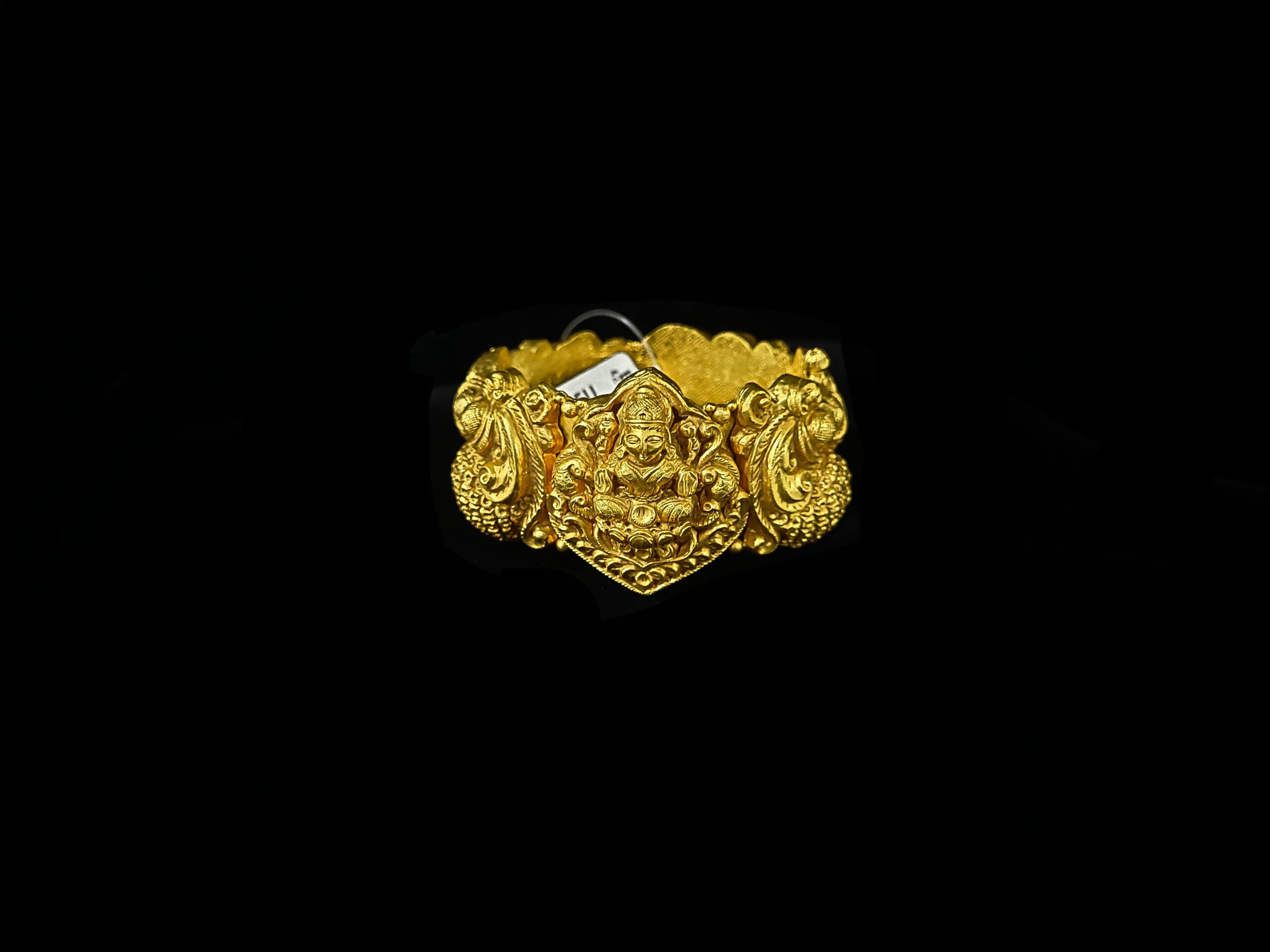 The ring is crafted using the traditional Nakshi technique, where gold is painstakingly hand-chiseled to create a three-dimensional, sculptural effect. The wide, scalloped band provides a comfortable fit while ensuring the piece commands attention. Finished with a deep antique polish that highlights every etched line, this ring serves as a modern heirloom—bridging the gap between ancient temple traditions and contemporary bridal or festive fashion.